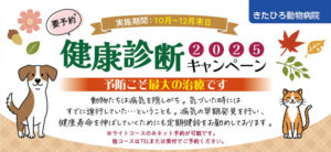 例年ご好評いただいている、予防薬購入キャンペーンを今年も実施いたします! *物価高騰が続きますが、動物たちの健康維持に必須な予防薬の価格は据え置いております。* 詳しくは下記をご覧ください。 お得に購入できるこの機会にぜひご利用ください。 NEWS よかったらシェアしてね! URLをコピーしました! URLをコピーしました! 3月診療時間変更のお知らせ ゴールデンウィークの診療日のお知らせ この記事を書いた人 kitahiro_ah 関連記事 🍁 秋の健康診断キャンペーン2025🍁 2025.09.19 10月の臨時休診のお知らせ 2025.09.18 〜眼科検診のご案内〜 2025.08.02 8月の診療時間、臨時休診のお知らせ 2025.08.01 6月の診療時間変更、 臨時休診のお知らせ 2025.05.22 ゴールデンウィークの診療日のお知らせ 2025.04.24 3月診療時間変更のお知らせ 2025.03.18 1月~2月限定!「シニア猫健診 特化プラン」キャンペーン 2025 2025.01.23